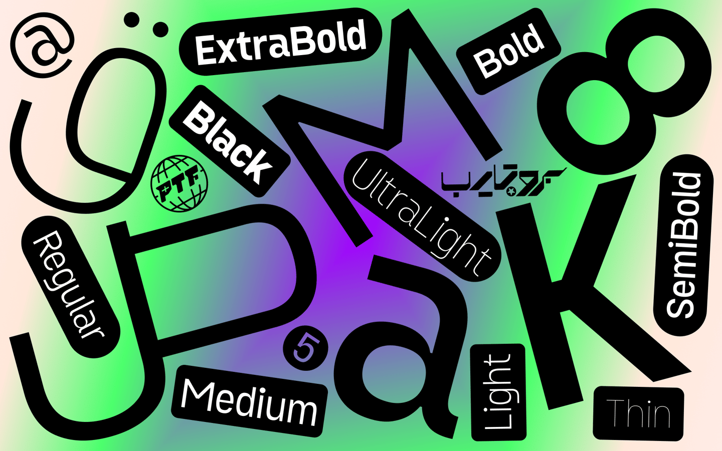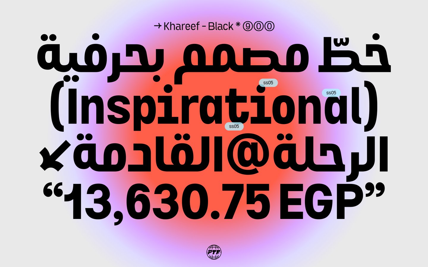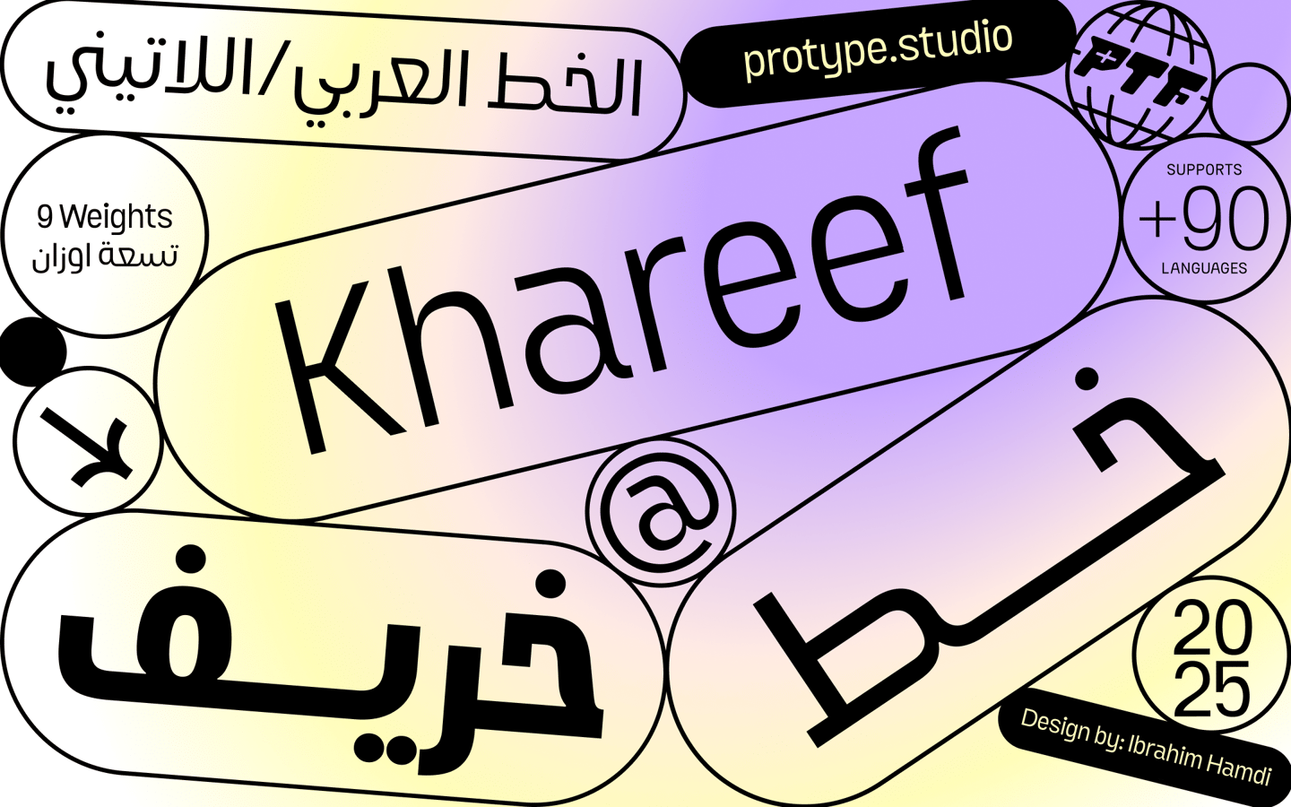 Available in nine static weights, Khareef also comes as a 2-axis variable font (weight and width axes) when ordering the full family. It supports Arabic, Latin, Kurdish, Persian, and Urdu, covering over 90 languages.