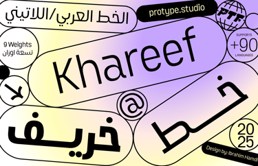Khareef (Autumn) is a multilingual script, a contemporary Grotesk typeface, the Arabic letterforms are inspired by the traditional Kufic script, reimagined with modern sensibilities — It brings together generous curves, structured geometry, and playful detailing to create a dynamic yet balanced visual identity. Designed with a solid geometric backbone, Khareef gracefully bridges Arabic and Latin scripts, offering both clarity and character.
