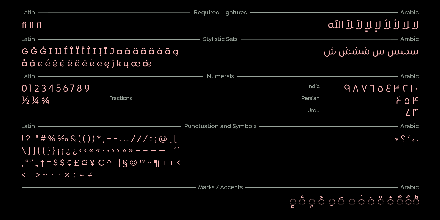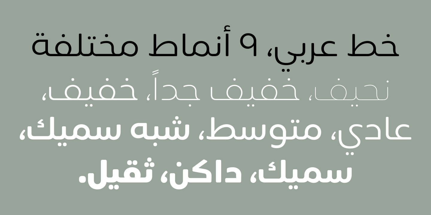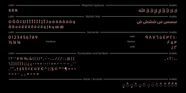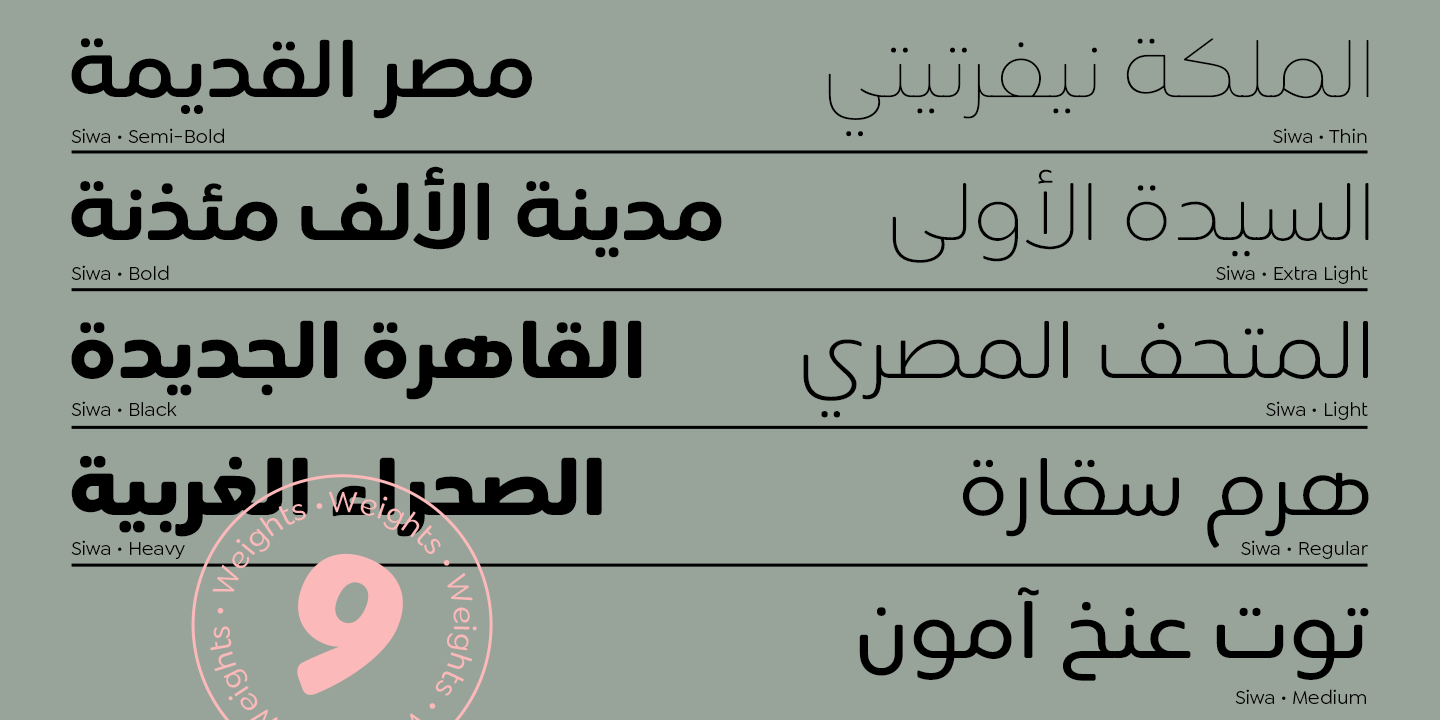 Available in nine weights from thin to black, supports OpenType feature for more than 90 languages, including all Latin and Arabic based languages letters and supports the Hindi, Latin, Persian and Urdu numbers. Siwa will speak your language!